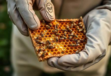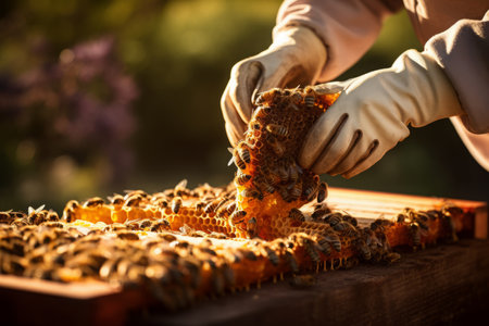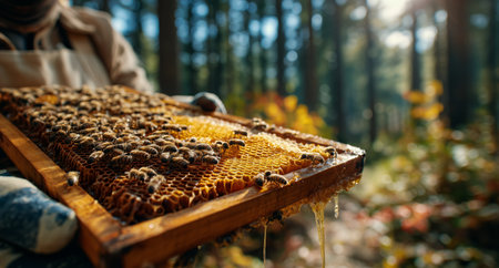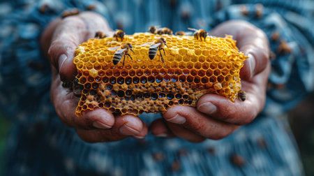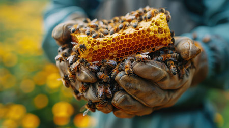 A beekeeper carefully holds a honeycomb full of active honey bees, showcasing their natural behavior and structure. The scene emphasizes the importance of bees in nature and agriculture.