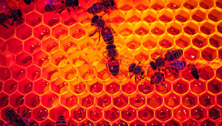In the heart of the hive, a queen bee inspects the work of her colony. Bathed in a warm, fiery glow, the honeycomb cells are filled with golden honey, a testament to their collective effort and natures perfect design.