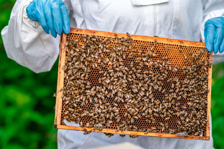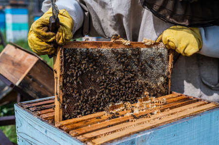 Beekeeper inspecting honeycomb frame at apiary at the summer day. man working in apiary. apiculture. Beekeeping concept.