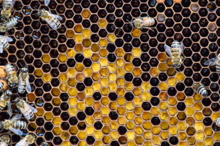 Frames of a beehive just taken from beehive with sweet honey. Busy bees on the yellow honeycomb with open and sealed cells for sweet honey. Bee honey collected in the beautiful brown honeycomb.