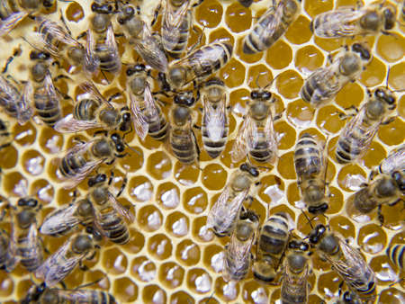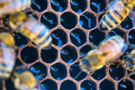 Close up view of the working bees on the honeycomb with sweet honey. Honey is beekeeping healthy produce.