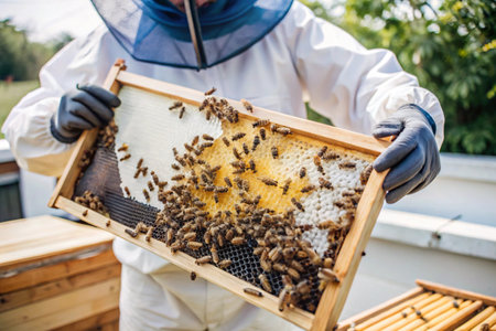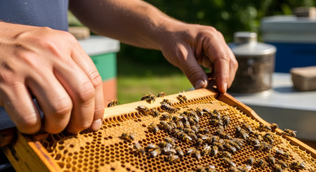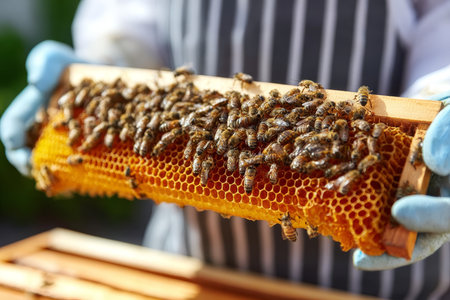 A beekeeper carefully holds and inspects a wooden frame covered with a colony of honey bees, checking the health of the hive. This close-up view highlights the process of beekeeping, honey production, and the intricate world of these important pollinators.