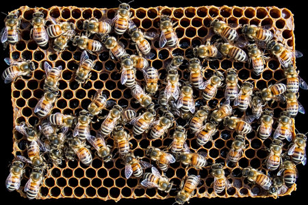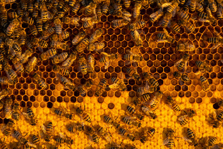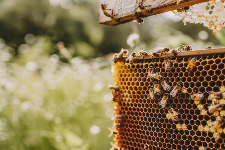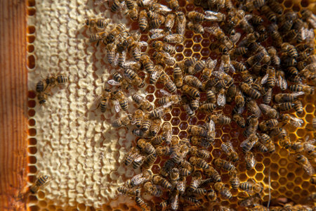 hardworking bees on honeycomb in apiary