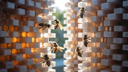Bees working on futuristic modular hive made of bio bricks