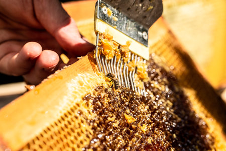 A tool of the beekeeper to work with bees. Smoker, cutting wax lids with hot fork from honeycomb for honey extraction, honeycomb concept,