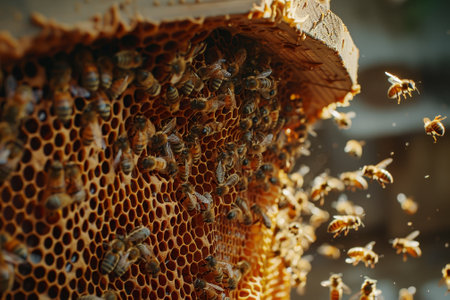 A hive of bees is seen in the image, with many of them flying around and some of them landing on the honeycomb. The bees are busy collecting nectar and pollen, and the hive is a hive of activity