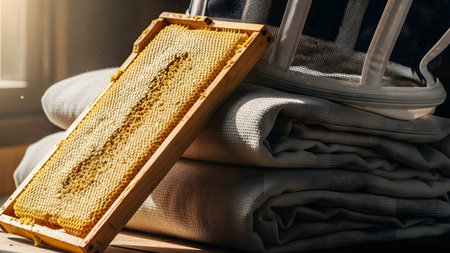 A wooden beehive frame filled with natural honeycomb resting against a beekeeper's protective suit. The image highlights the tools and equipment used in sustainable honey production.