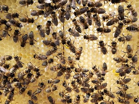Bees on the honeycomb, background. Honey cell with bees. Apiculture. Apiary. Wooden beehive and bees. Beekeeping and honey production image