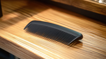 A sleek black hair comb rests on a wooden shelf, showcasing a minimalist design ideal for personal care and grooming in modern settings.