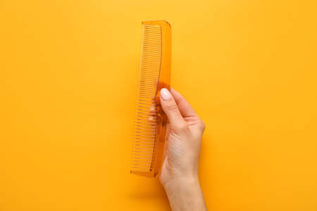 Female hand with plastic hair combo on color background