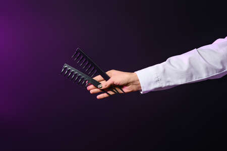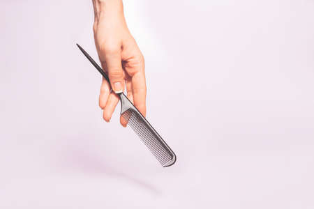 Had holding comb tool under trendy color background with copy space and soft light. Stylish Professional Barber hair cut tools, Hairdresser salon concept, Haircut accessories.