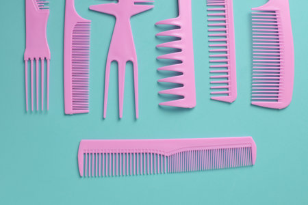 Set of pink plastic combs on mint green background.