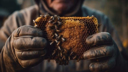 The beekeeper holds a honey cell with bees in his hand. Generative AI