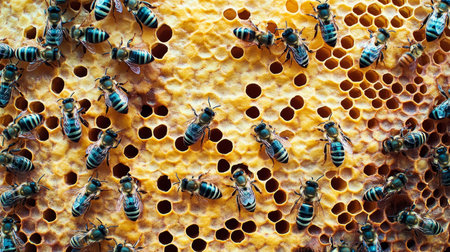 Discover the intricate activity of bees diligently working on honeycomb cells within their hive. This close-up captures their natural beauty and vital role in the ecosystem.