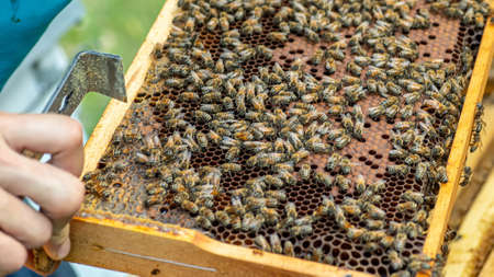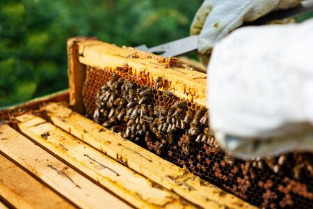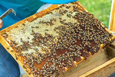 Frames of a bee hive. Beekeeper harvesting honey. The bee smoker is used to calm bees before frame removal. Close up.