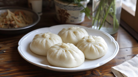 AI Generated. Deliciously Soft Steamed Pork Buns with Juicy Filling on White Plate with Fresh Herbs