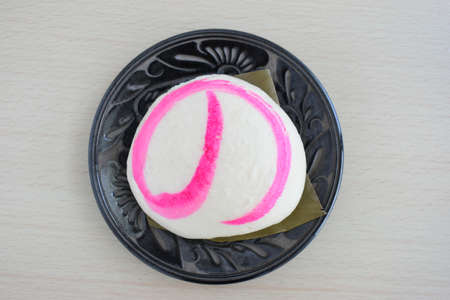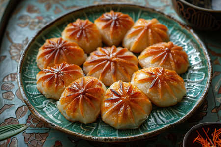 Close up of Chinese plate shaped red bean paste buns