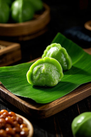 AI Generated. Steamed purple taro bun placed on a round wooden dish with a single nut on top next to a small white cup on a dark wood table