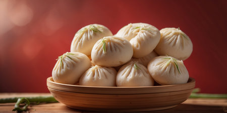 AI Generated. Steamed Buns in a Bamboo Steamer on a Red Background