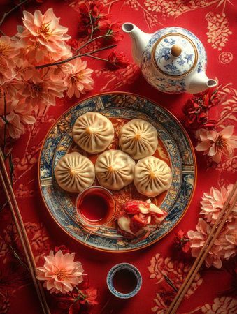 Traditional Chinese dumplings served with soy sauce and teapot on red tablecloth - ai