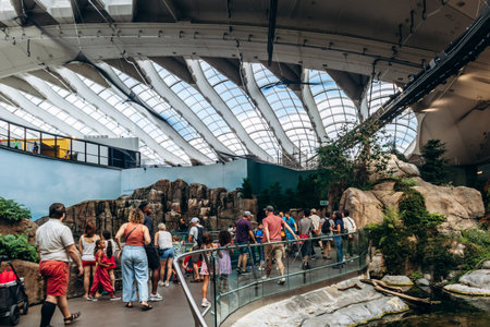 Montreal, Canada - August 14, 2025: Visitors walking through indoor exhibit area at the Biodome of Montreal