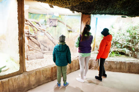 Mother with kids discovering and watching animals at zoo.