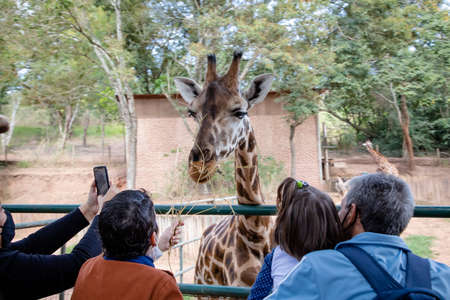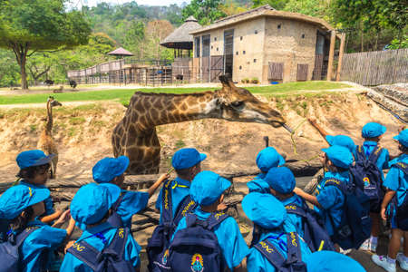 PATTAYA, THAILAND - FEBRUARY 23, 2020: Group of thai school children are feeding giraffe in Khao Kheow Open Zoo