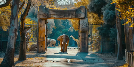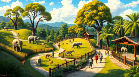 A blurred background of a zoo, blending nature, colors, and distant animal shapes