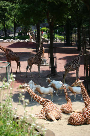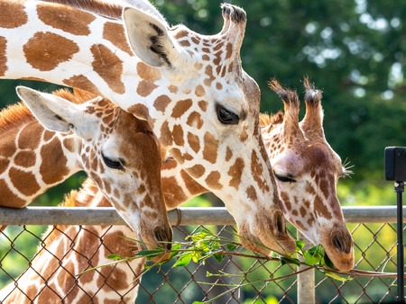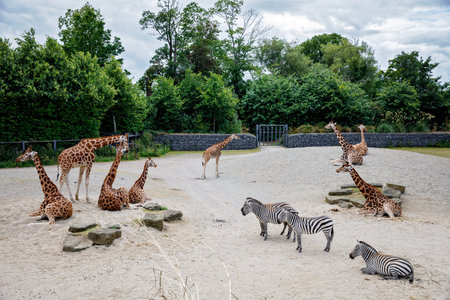 Giraffes and zebras in a wildlife park, zoo safari on sunny summer day. Activity for families with children.