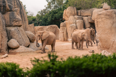 A group of elephants gather in a natural habitat surrounded by rocks and greenery. The image captures the social behavior of the elephants and the tranquil environment, highlighting natural setting.