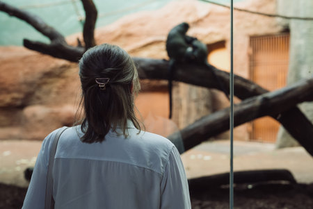 Woman watching monkeys at the city zoo.
