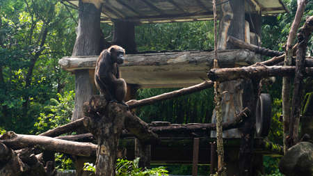 Big male gorilla with silverback sits on a fallen tree over an abyss over in the national zoo.