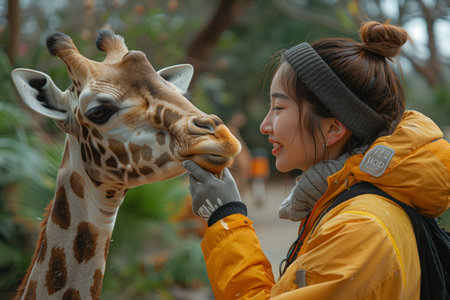 Woman Touching Giraffes Face at Zoo