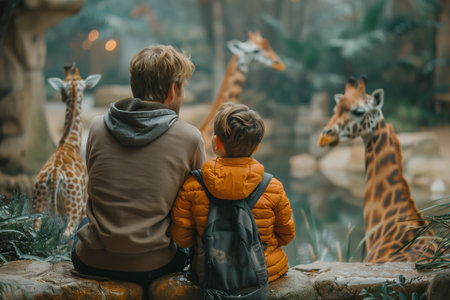 A Father and Son Observe Giraffes at the Zoo