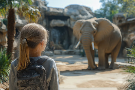 A child observes an elephant at a zoo in the afternoon sun