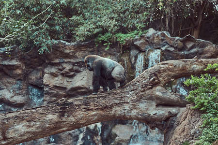 Big male gorilla with silverback walks on a fallen tree over an abyss over in the national zoo.