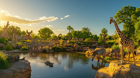 Explore a stunning wildlife scene featuring giraffes and zebras at sunset in a natural reserve.
