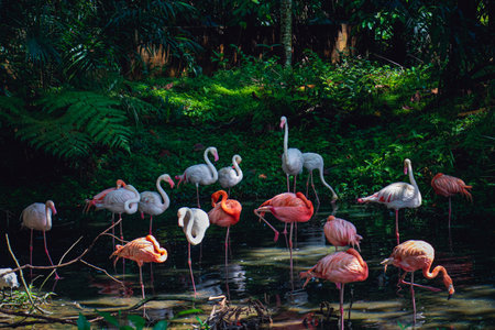 A large flock of Greater Flamingos (Phoenicopterus roseus) in Negara Zoo, Malaysia. Enjoying summer in pond and eating food from the mud.