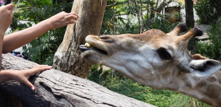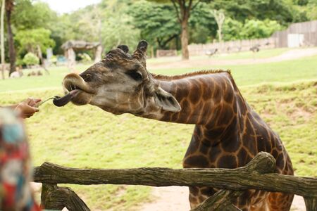 Wildlife Life. Giraffe with its tongue sticking out craned its neck and picks up a bean pod from a tourist hands