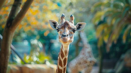 funny giraffe walking between trees in zoological park, barcelona, spain