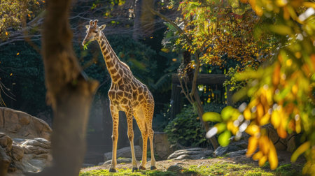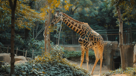 Tall giraffe standing beside its enclosure and building at Belgrade Zoo in autumn. Elegant animal in natural light