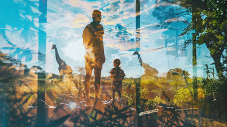 A father and his young son stand in front of a window, looking out at two giraffes in a grassy field. The sun is setting in the distance, casting a warm glow on the scene. The image is slightly blurred, creating a dreamy and nostalgic feel.