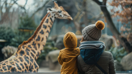 A mother and her young child, bundled in warm winter clothing, watch a giraffe through a glass enclosure at the zoo. The child is wearing a yellow hooded jacket, while the mother has a knit hat with a brown pom-pom and a blue scarf. The giraffe's long neck and patterned coat are visible in the background.