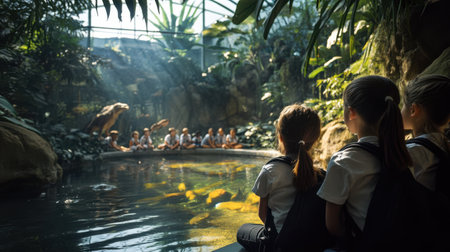 Students engage in a learning experience at a wildlife sanctuary, attentively observing animals and nature. The serene environment enhances their understanding of biodiversity.