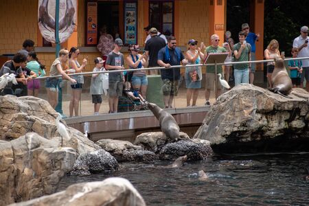 Orlando, Florida. July 26, 2019. People photographing sea lions, with cell phones at Seaworld.