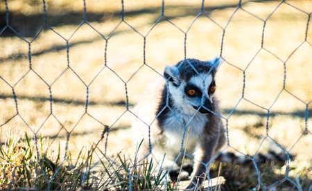 Exotic lemur sits behind zoo fence in calm pose awaiting human interaction.