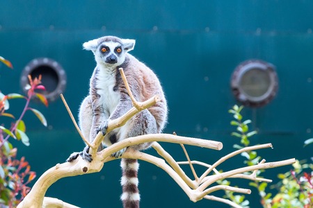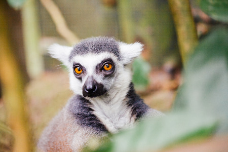 Close up photo of ring tailed lemur. Cute animal with protruding muzzle and orange eyes