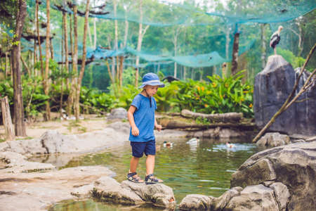 Little boy observing birds at the zoo