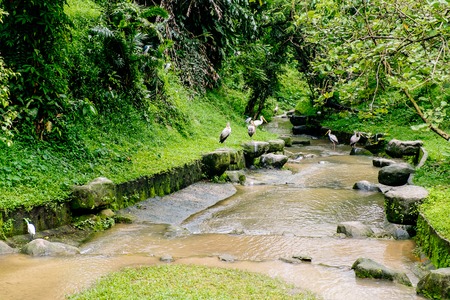 Pelicans in natural birds park on Ubud,Bali island,Indonesia