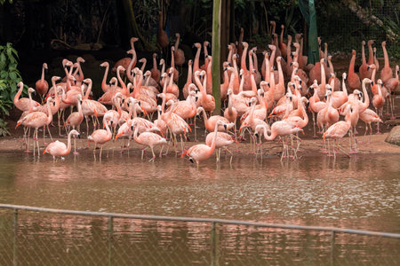 Group of flamingos next to the lake drinking water and live in natural zoo surrounding